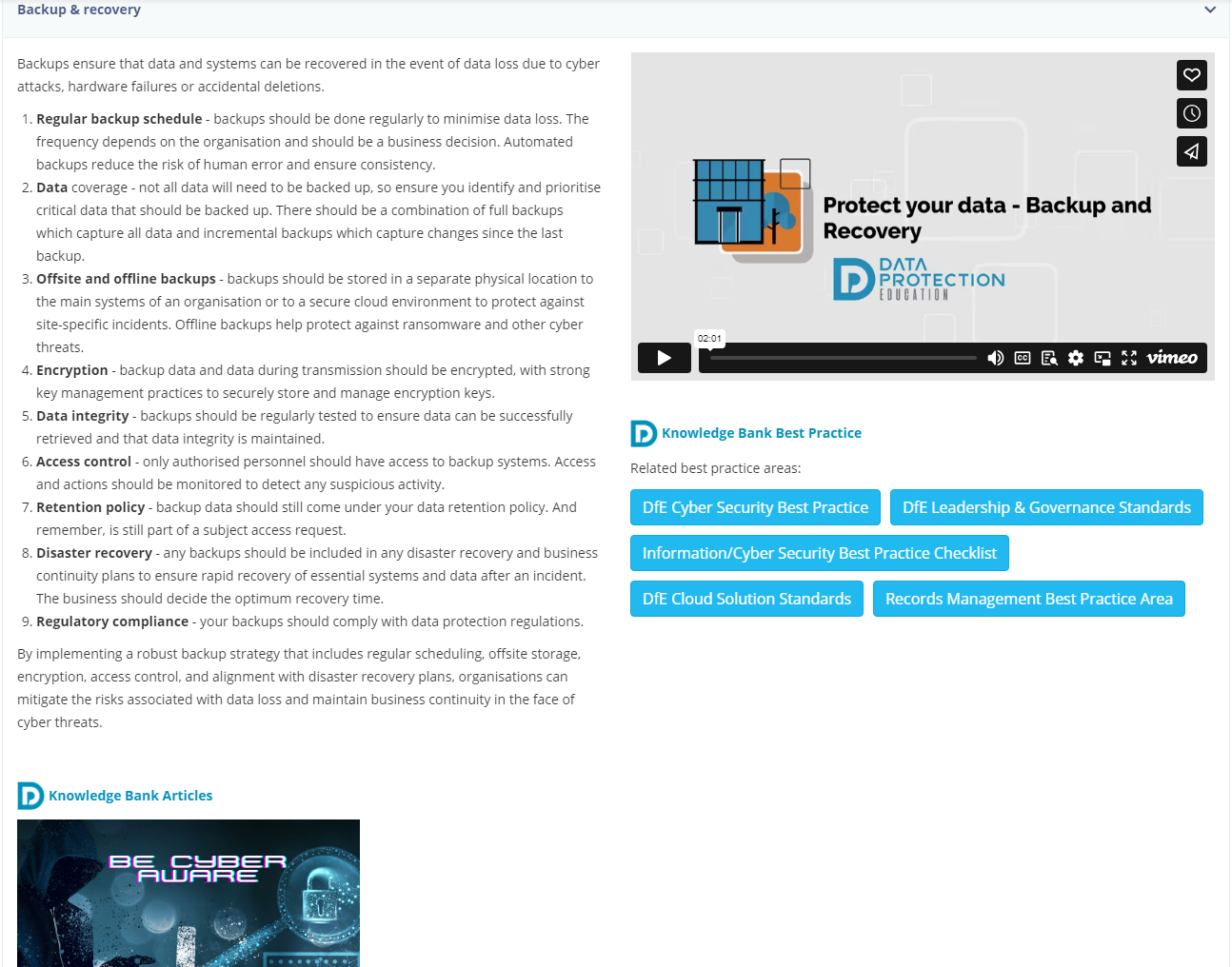 Each topic has detailed information, a micro learning video, links to other best practice areas and related articles and guidance: