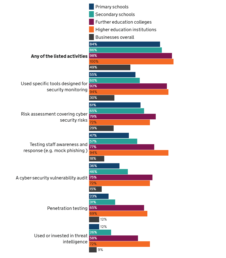 Small businesses have increased their uptake of cyber insurance from last year from 49% to 62%. A minority of primary schools (6%) and secondary schools (13%) have a specific cyber insurance policy. However, just under half of primary schools (47%) and secondary schools (43%) reported having cyber security cover as part of a broader insurance policy.